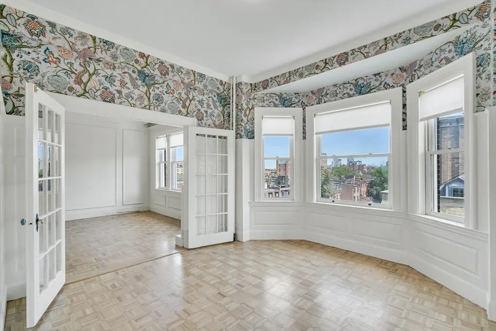Sunny and sophisticated 7th floor home in a classic Back Bay residence with spectacular city views, ideally located at the corner of Commonwealth Ave and Hereford Street. This gracious home is warm and inviting and flooded with natural light from the 7 large windows in the main living area. The thoughtful floor plan is wonderful for entertaining -- you'll enjoy the Boston Marathon from your living room -- with a galley-style kitchen, a full dining room, a large living/family room, and the powder room discretely placed near the foyer. The primary bedroom has a excellent closet space and delightful morning sun, while the second bedroom features custom shelving and closets. This well-maintained building has been carefully updated since 2018 -- with a a new roof and roof deck -- a wonderful place to watch July 4th fireworks -- updated hallways, extensive exterior work and a modernized elevator. Laundry, extra storage and bike storage on the first floor. Many rental parking options nearby.