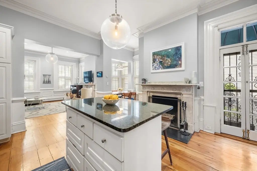 This elegant 2-bed /2-bath residence with a parking spot located in a historic brownstone feels like a Back Bay home & is central to Charlestown’s best restaurants, shops & public transportation. With soaring 10.5 foot ceilings, crown molding & 13 windows w/ corner exposure allowing for abundant natural light, this inviting home is truly one of a kind. The sought after open layout is ideal for today’s living. The sunny kitchen features a freestanding island, w/white cabinetry, ss. appliances including Bertazzoni gas range, & a stunning wood burning fireplace. The well-placed dining sits directly off of the kitchen. Two glass doors lead to the inviting outdoor patio. The sun-drenched living room has a marble fireplace & a separate dining area. Custom built in-unit washer/dryer laundry nook. Both bedrooms are spacious & sun filled. Direct access to 1 full deeded parking space. Modern amenities & historic details throughout. Pet Friendly. Walk to Whole Foods, Monument Park & the "T",